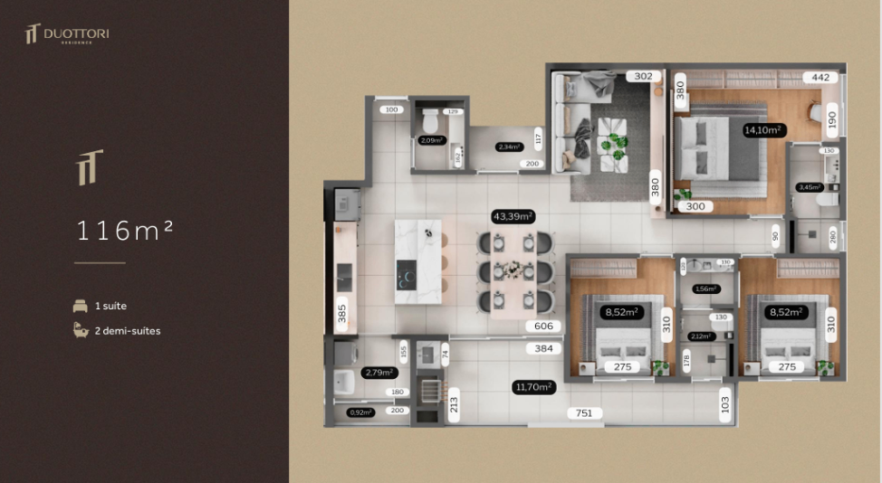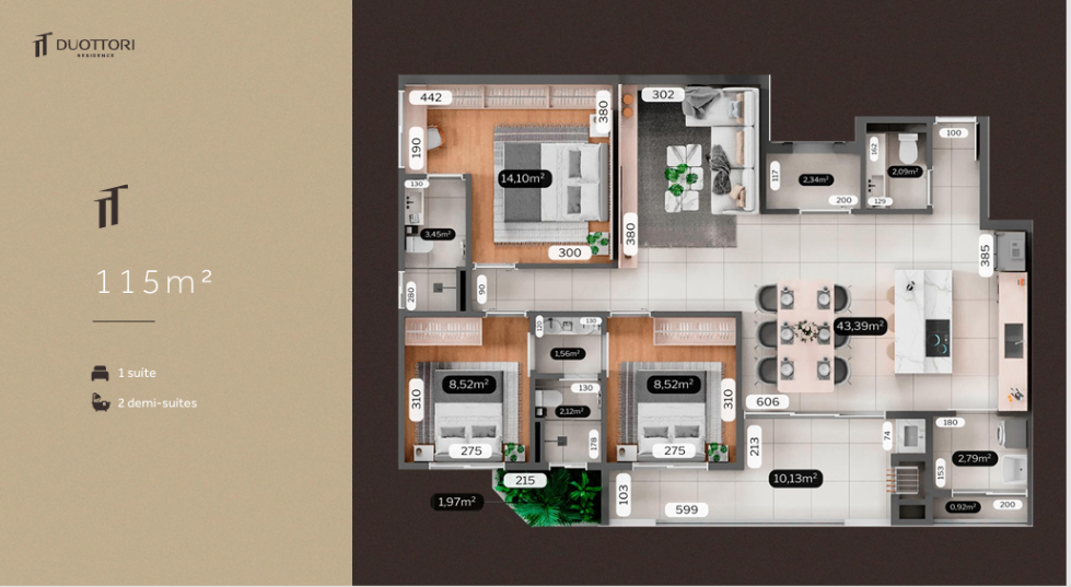 O Duottori Residence foi pensado para quem valoriza arquitetura moderna e exclusiva, aliada à funcionalidade no dia a dia. O projeto oferece plantas inteligentes de 97,48 m², 115 m² e 116,82 m², com ambientes bem distribuídos, que priorizam conforto, praticidade e aproveitamento dos espaços. A ampla área de lazer reúne os principais itens para tornar a vida mais dinâmica, equilibrando convivência, descanso e bem-estar — sem excessos, mas com tudo o que realmente faz diferença na rotina.