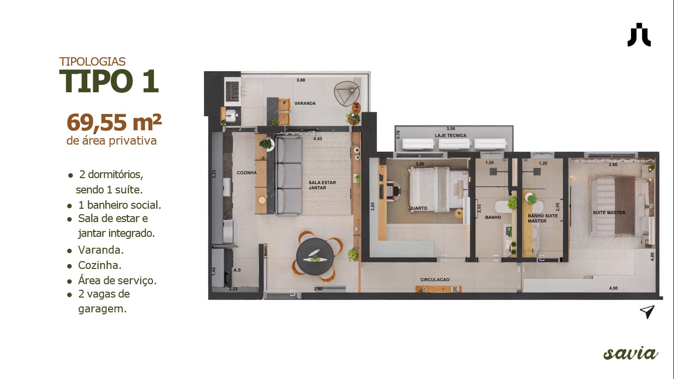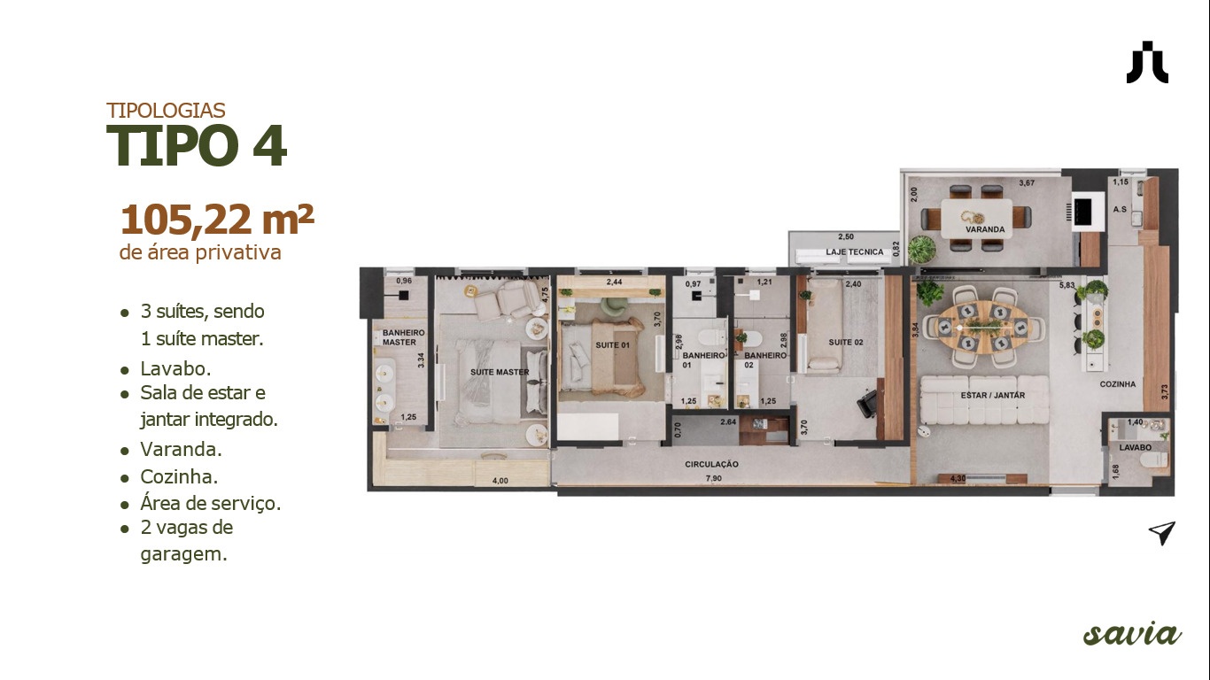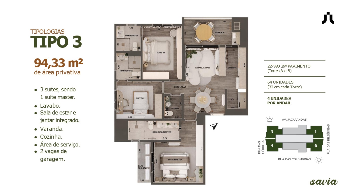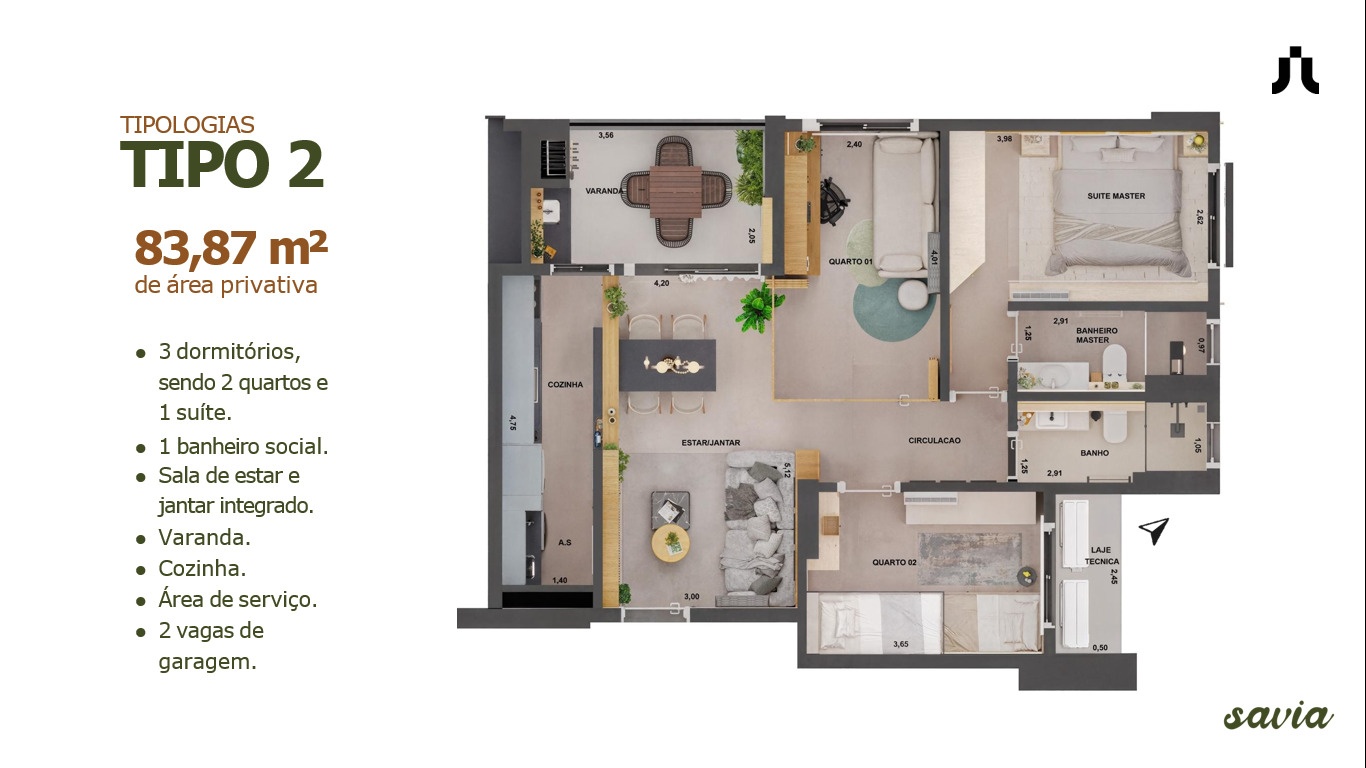 Savia — viver bem começa pela escolha certa O Savia nasce como um novo capítulo da verticalização inteligente de Sinop. Um empreendimento pensado para quem entende que morar bem não é apenas sobre metros quadrados, mas sobre funcionalidade, localização, conforto e qualidade de vida. Com plantas inteligentes, o Savia foi projetado para otimizar cada espaço, respeitando a rotina de quem valoriza praticidade sem abrir mão de bem-estar. Ambientes bem distribuídos, soluções modernas e um projeto que conversa com o presente e o futuro da cidade. A área de lazer ampla e bem planejada reforça esse conceito: espaços pensados para desacelerar, conviver, criar memórias e viver a casa além das paredes do apartamento. Um convite ao equilíbrio entre vida urbana e momentos de pausa. Localização estratégica para uma vida mais leve Morar no Savia é estar perto do que realmente importa. O empreendimento está inserido em uma região com acesso facilitado a escolas, mercados, vias rápidas e ao centro da cidade, garantindo mobilidade, praticidade e valorização constante. Menos tempo no trânsito. Mais tempo para você. com 3 Tipologia de Apartamento 69,55m2; 83,87m2; 94,33m2 e 105,22m2